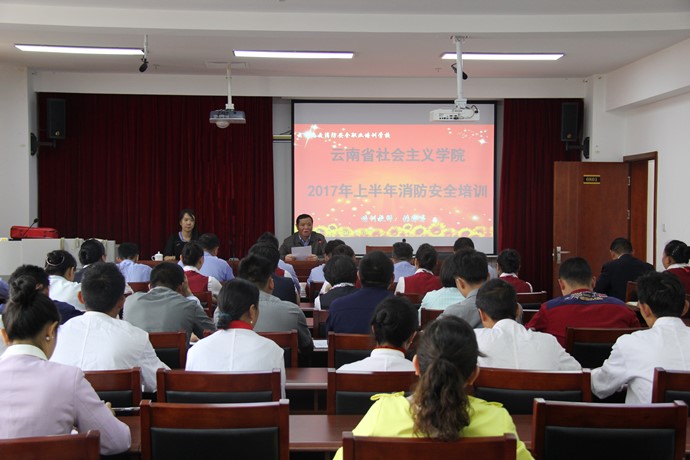 本站訊 為貫徹落實2017年夏季消防工作要求,做好云南社院火災防控管理工作,堅決預防和遏制火災事故的發生,消除火災隱患,增強消防安全意識,提高火災預防和自救能力,確保云南社院消防安全。6月30日,云南社院舉辦了2017年上半年消防安全知識培訓和火災自救逃生疏散演練及滅火實戰演練。此次培訓由學院黨組成員、副院長彭立峰主持,云南尚云消防安全職業培訓學校張婷婷老師主講,學院部分教職工、教學服務中心全體員工、臨街承租戶及轄區護國派出所、景星社區相關人員參加培訓。