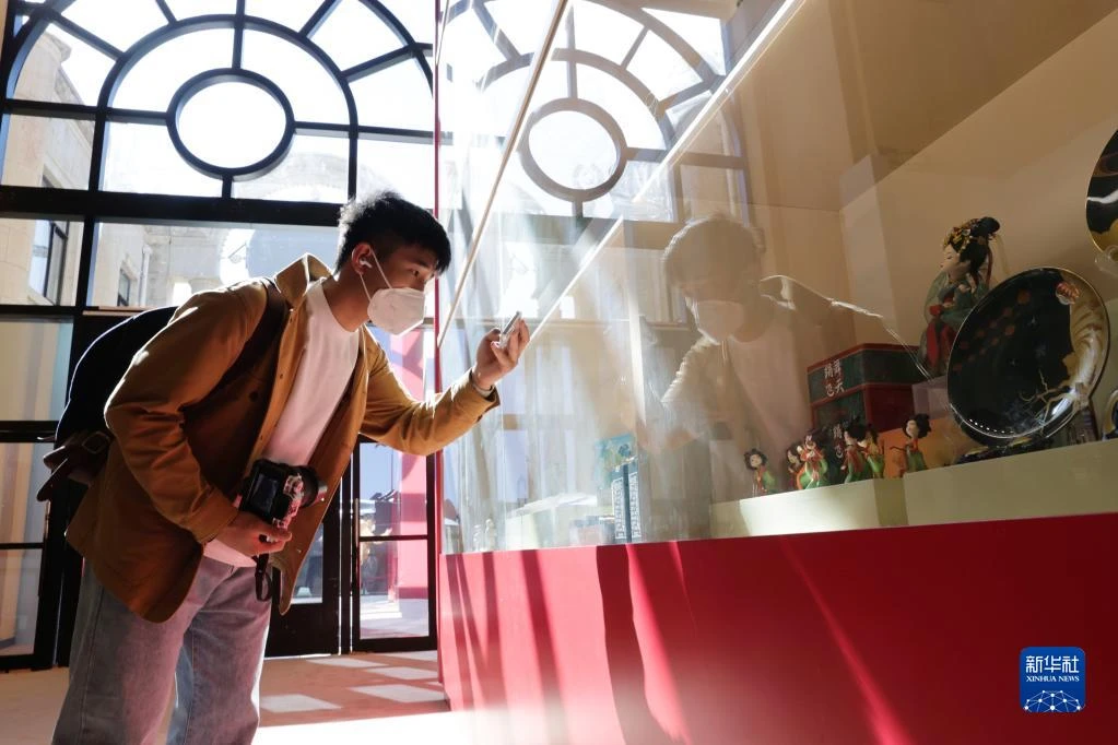 10月10日,觀眾在“奮進新時代”主題成就展第五單元“堅定文化自信 建設社會主義文化強國”展廳拍攝展示代表性非遺作品和文創精品的博古架。新華社記者 張玉薇 攝