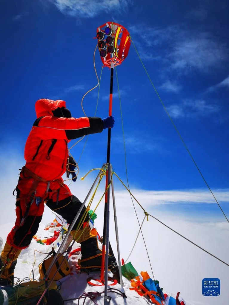2020珠峰高程測量登山隊隊員在珠穆朗瑪峰峰頂開展測量工作(2020年5月27日攝)。新華社特約記者 扎西次仁 攝