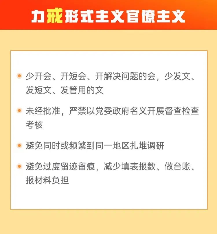 省委、省政府反復強調,一定要開短會、講短話、發短文,注重實效,留出更多時間和精力抓落實,并要求省級機關帶好頭、黨政“一把手”做表率,形成開短會、講短話、發短文的好習慣,以此提高工作效率,提升工作成果?!兑幎ā访鞔_提出,要精減會議文件,科學制定并嚴格執行年度發文、會議計劃,減少臨時性發文、開會。少開會、開短會、開解決問題的會,少發文、發短文、發管用的文。要統籌規范督查檢查考核,嚴格執行督檢考年度計劃和審批備案制度,未納入計劃或未審批備案的,不得擅自開展。未經批準,嚴禁以黨委政府名義開展督查檢查考核,設置以下級黨委政府為對象的督查檢查考核。要科學開展調研,注重調研的針對性和實效性,重在了解情況、推進工作、解決問題、總結推廣經驗。避免同時或頻繁到同一地區扎堆調研。要改進方式方法,避免過度留跡留痕,減少填表報數、做臺賬、報材料負擔。除黨中央和省委明確規定外,不得將成立議事協調機構、制定工作方案、召開會議、印發文件、紀要記錄等作為評價工作的依據。