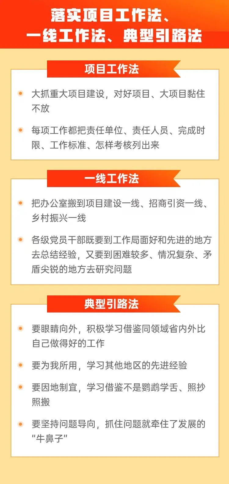 項目工作法,旗幟鮮明大抓重大項目建設,對好項目、大項目黏住不放,加強項目調度和要素保障,扭轉投資下滑,加快補齊產業短板。堅持任務項目化、項目清單化、清單具體化,把政策變成思路、把思路變成方案、把方案變成一個個具體項目,每項工作都把責任單位、責任人員、完成時限、工作標準、怎樣考核等清清楚楚列出來,形成時限清單、任務清單、責任清單,通過時間倒排、任務倒逼、責任倒查,推動工作落實。