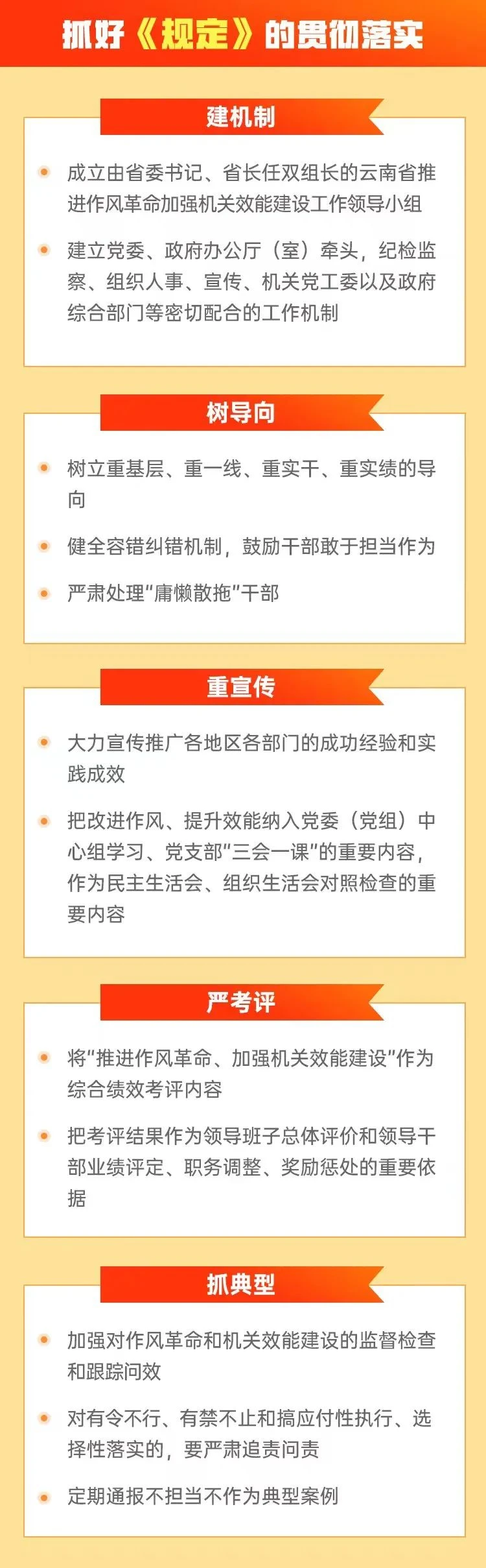 一是建機制。為抓好《規定》貫徹落實,成立由省委書記、省長任雙組長的云南省推進作風革命加強機關效能建設工作領導小組,建立黨委、政府辦公廳(室)牽頭,紀檢監察、組織人事、宣傳、機關黨工委以及政府綜合部門等密切配合的工作機制,不斷推進作風革命加強機關效能建設。二是樹導向。樹立重基層、重一線、重實干、重實績的導向,健全容錯糾錯機制,鼓勵干部敢于擔當作為。嚴肅處理“庸懶散拖”干部,對在貫徹執行黨的路線方針政策和決策部署中,庸碌無為、作風散慢、遇事推脫不擔當、工作不用心不用力不負責的干部,堅決果斷調整處理。三是重宣傳。大力宣傳推廣各地區各部門的成功經驗和實踐成效,發現培育典型、總結宣傳典型、大力推廣典型,形成示范引領、比學趕超的良好氛圍;把改進作風、提升效能納入黨委(黨組)中心組學習、黨支部“三會一課”的重要內容,作為民主生活會、組織生活會對照檢查的重要內容。四是嚴考評。將“推進作風革命、加強機關效能建設”作為綜合績效考評內容,科學設置考評指標,強化平時考評工作;把考評結果作為領導班子總體評價和領導干部業績評定、職務調整、獎勵懲處的重要依據。五是抓典型。加強對作風革命和機關效能建設的監督檢查和跟蹤問效,用好明查暗訪、典型問題曝光,打好整治作風問題的“組合拳”,對有令不行、有禁不止和搞應付性執行、選擇性落實的,要嚴肅追責問責。定期通報不擔當不作為典型案例,讓“躺平式干部”躺不住、讓混日子的沒有市場。