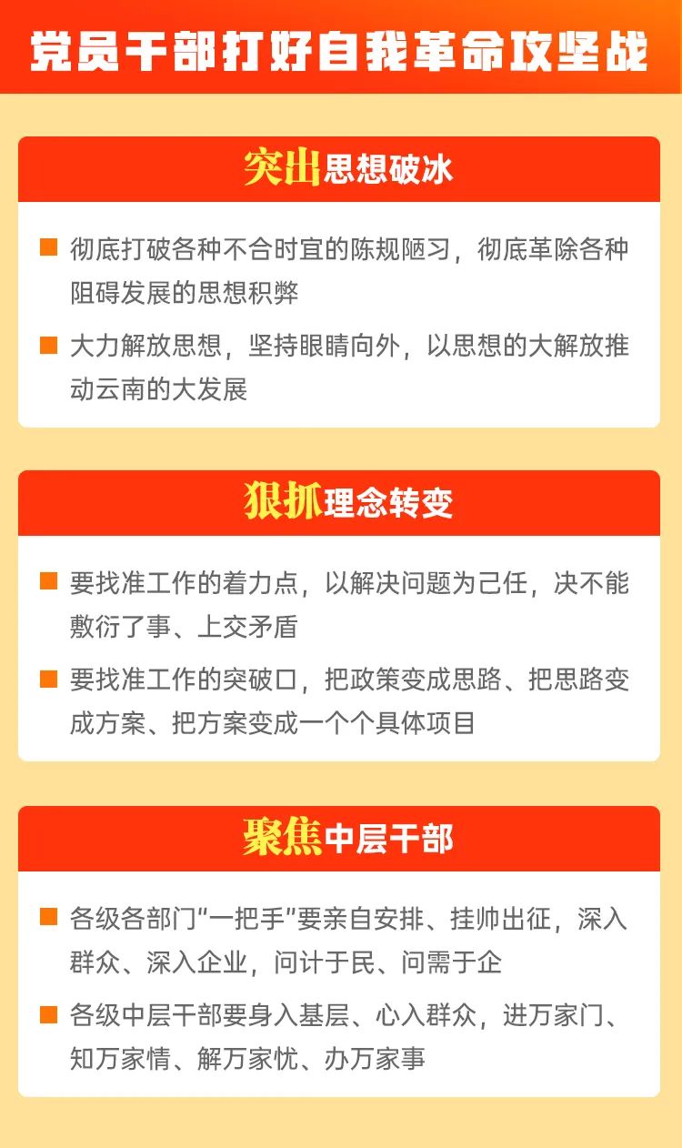 一是突出思想破冰,必須強力推進思想觀念革故鼎新。云南發展不夠快、不夠好,根子還是思想解放不夠,不敢想、不敢闖、不敢試。干部干部,干字當頭,當干部就是要干活,就是要擔當盡責、有所作為,決不能坐而論道、光說不練,混日子、當懶漢;要爭做實干家、實踐者,決不能當旁觀者、當看客,更不能做“評論家”。省委、省政府部署開展作風革命、效能革命,首先就是要求各級黨員干部進行一場深刻的思想上的自我革命,徹底打破各種不合時宜的陳規陋習,徹底革除各種阻礙發展的思想積弊,堅決破除安于現狀的“守攤子”思想、地處邊疆難有作為的消極思想、甘于落后的“跟跑”思想、不給資金項目就不干事的“等靠要”思想、“只要不出事,寧可不干事”的“太平官”思想、盲目樂觀自我滿足的狹隘思想,全面提振干事創業的精氣神。要求全省廣大黨員干部用創新的思維、改革的辦法謀全局、解難題、促跨越,跳出固化的發展思路,大力解放思想,堅持眼睛向外,學習借鑒先進省區的好經驗好做法,開拓思路、開闊眼界、創新方法,用好“拿來主義”,結合實際情況,做到為我所用,以思想的大解放推動云南的大發展。