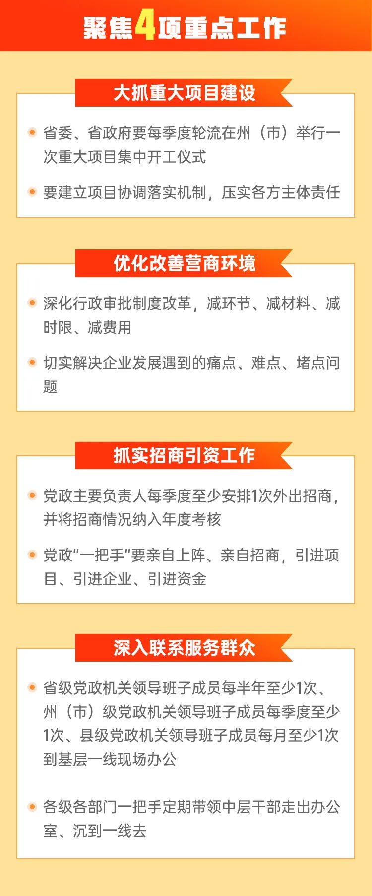 圍繞大抓重大項目建設,《規定》明確提出,省委、省政府要每季度輪流在州(市)舉行一次重大項目集中開工儀式,讓每個州(市)比一比、曬一曬,形成你追我趕、奮勇爭先的良好發展局面。要建立項目協調落實機制,由省發展改革委抓好統籌協調調度,壓實各方主體責任,明確“中長期重大項目和年度省級重大項目,按屬地原則由各州(市)政府負責管理推進,省級行業主管部門指導”,“年度‘重中之重’項目、跨州(市)項目、省本級項目,按所屬行業由省政府分管領導定期協調,省級行業主管部門主要領導掛鉤管理”。