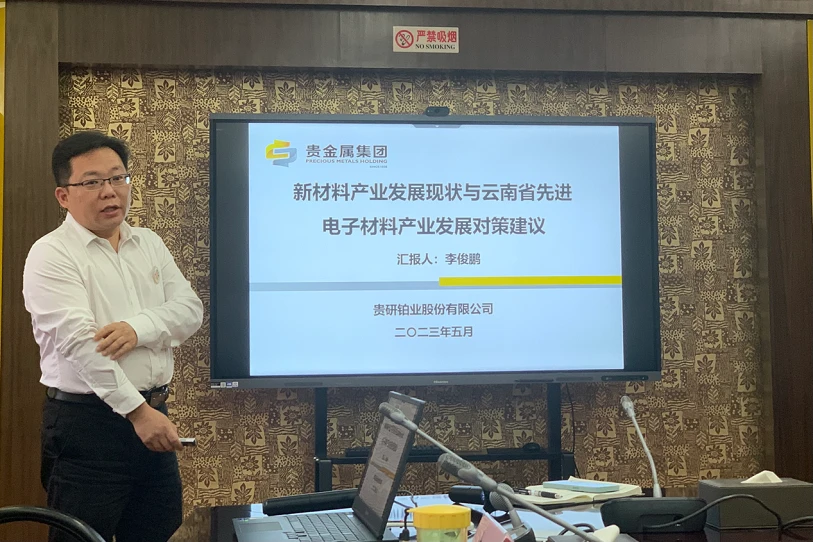 “習近平總書記提出‘加快科技自立自強步伐,解決外國‘卡脖子’問題’的重要戰略部署為我們開展科技創新指明了前進方向、提供了根本遵循。”民盟盟員、貴研鉑業股份有限公司電子漿料首席研究員、貴研電子材料(云南)有限公司副總經理李俊鵬以《新材料領域發展現狀與云南省先進電子材料產業發展對策建議》為題,從新材料產業發展現狀、先進電子高端領域的關鍵材料本土化需求和材料基因研究方法應用、先進電子材料產業發展對策建議三方面進行交流分享。