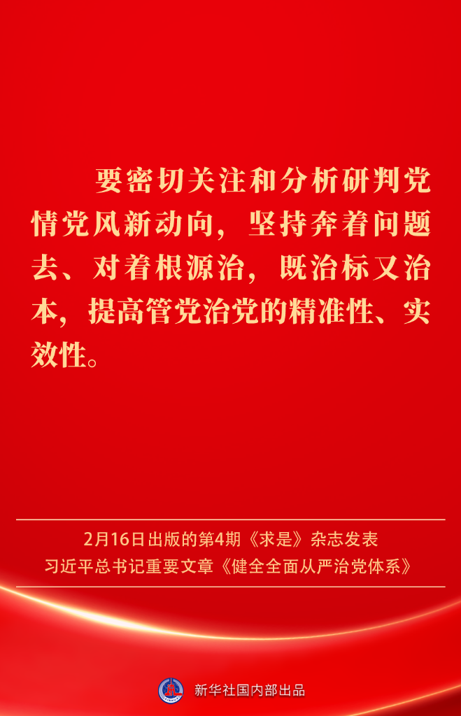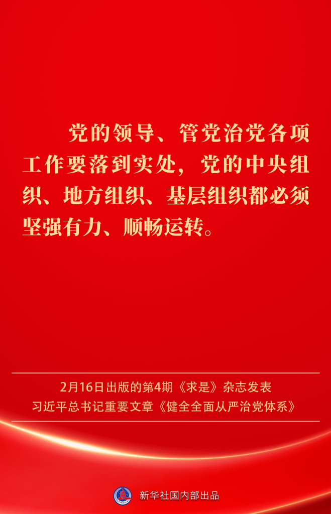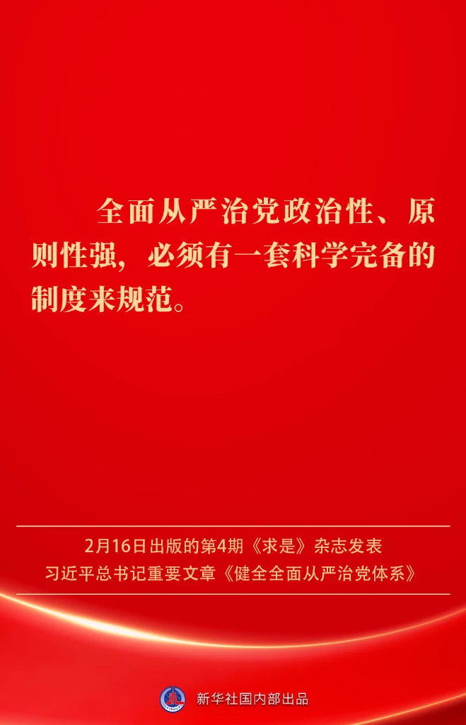 2月16日出版的第4期《求是》雜志發(fā)表習(xí)近平總書記重要文章《健全全面從嚴(yán)治黨體系》。如何進(jìn)一步健全要素齊全、功能完備、科學(xué)規(guī)范、運(yùn)行高效的全面從嚴(yán)治黨體系?習(xí)近平總書記闡明要旨——