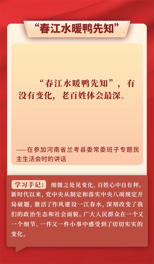 “問(wèn)渠那得清如許?為有源頭活水來(lái)。”關(guān)于作風(fēng)建設(shè),習(xí)近平總書記常引用各種古語(yǔ)典故,有的從警示層面講危害,有的從倡導(dǎo)層面談踐行,旁征博引、畫龍點(diǎn)睛,把古人智慧化用于作風(fēng)建設(shè)的當(dāng)代實(shí)踐,給人以思想啟迪、靈魂洗禮。