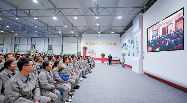 3月20日,麗江現代花卉產業園區員工集中觀看習近平總書記在云南考察的新聞報道。云南日報記者 胡妤雅/攝