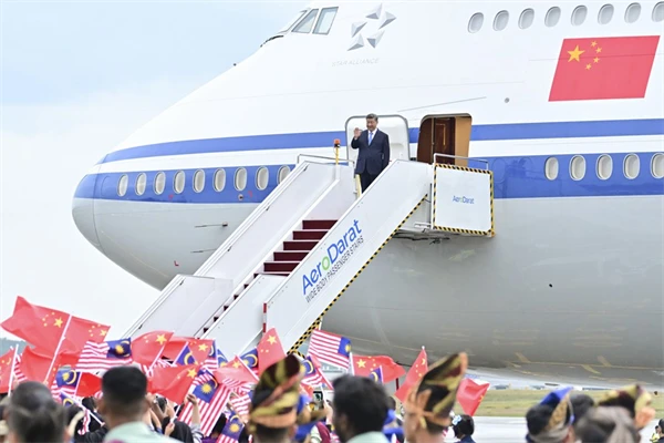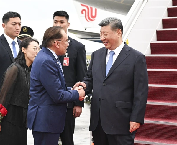 專機抵達吉隆坡國際機場時,馬來西亞總理安瓦爾,外交部部長穆罕默德,陪同部長、交通部部長陸兆福等高級官員熱情迎接。馬來西亞兒童向習近平獻花,馬來西亞青少年表演富有當地特色的舞蹈,揮舞中馬兩國國旗,熱烈歡迎習近平到訪。
