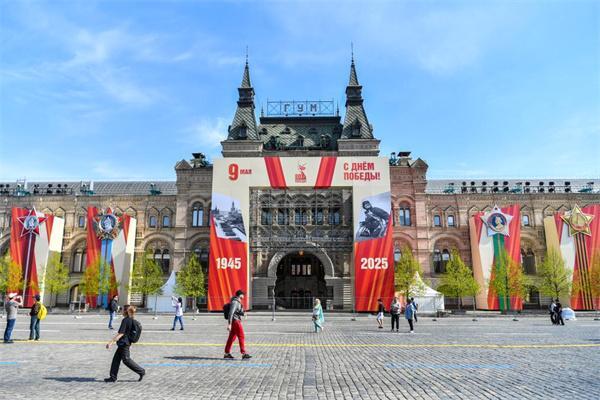 紀念蘇聯偉大衛國戰爭勝利80周年慶典前夕,莫斯科街頭,寫有“勝利”字樣的旗幟隨風飄揚。在路邊,以蘇聯衛國戰爭歷史為主題的圖片展板和裝飾櫥窗吸引行人停下腳步,或合影留念,或瀏覽沉思。