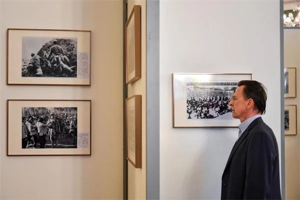4月18日,在俄羅斯首都莫斯科,嘉賓參觀紀念中國人民抗日戰爭暨世界反法西斯戰爭勝利80周年圖片展。新華社記者 曹陽 攝