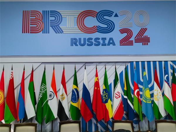 這是2024年10月24日在俄羅斯喀山拍攝的金磚峰會標識和國旗。新華社記者 李學仁 攝