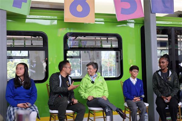 2023年8月10日,哥倫比亞波哥大市長(zhǎng)克勞迪婭·洛佩斯(中)在波哥大地鐵的模型車廂旁跟參加活動(dòng)的師生交流。按照計(jì)劃,由中企承建和運(yùn)營(yíng)的波哥大地鐵一號(hào)線將在2028年正式投入運(yùn)營(yíng)。新華社記者 周盛平 攝