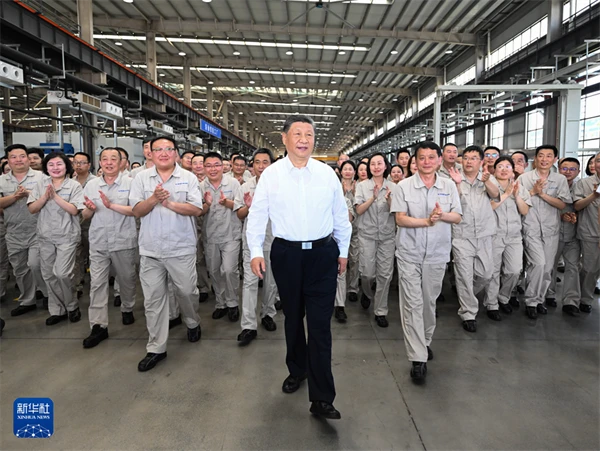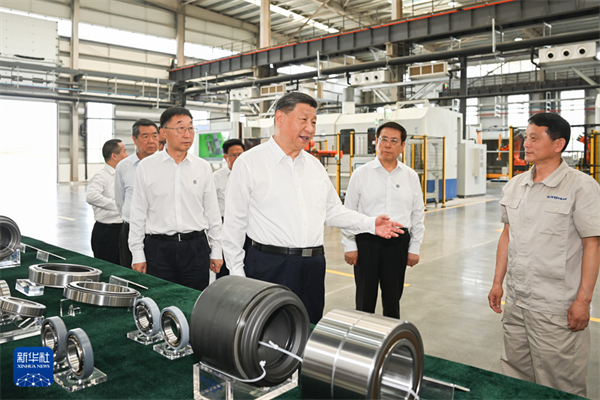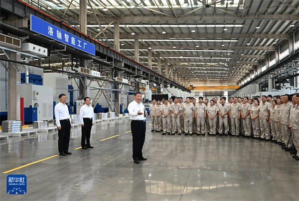 19日下午,習近平首先來到洛陽軸承集團股份有限公司考察。該公司前身為“一五”期間建成的洛陽軸承廠。在智能工廠,習近平了解企業發展歷程,聽取不同類型軸承產品用途和性能介紹,走近生產線察看生產流程。他對圍攏過來的企業職工說,制造業是國民經濟的重要支柱,推進中國式現代化必須保持制造業合理比重。現代制造業離不開科技賦能,要大力加強技術攻關,走自主創新的發展路子。他勉勵職工發揚主人翁精神,在企業發展中奮發有為、多作貢獻。