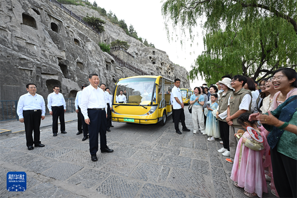 已有1500多年歷史的龍門石窟,是重要的世界文化遺產。習近平來到這里,察看石窟整體布局風貌和代表性窟龕、造像,同現場的文物保護工作者親切交流。他強調,要把這些中華文化瑰寶保護好、傳承好、傳播好。游客們見到總書記,都十分欣喜,紛紛向總書記問好。習近平不時同大家交流,特別鼓勵小朋友們多到實地尋溯中華文化,從小樹立文化自信。他指出,文旅融合前景廣闊,要推動文旅產業高質量發展,真正打造成為支柱產業、民生產業、幸福產業。