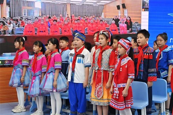 2025年3月28日,在“壯蒙一家親 共筑中國夢”手拉手主題云隊會上,廣西南寧市濱湖路小學四(1)中隊隊員通過網絡和內蒙古鄂爾多斯東勝區第十二小學四(9)中隊隊員一起唱《中國少年先鋒隊隊歌》。新華社記者 周華 攝