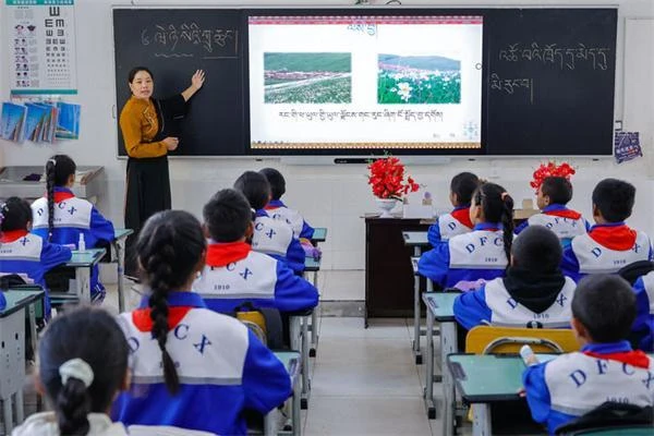 2024年9月27日,在四川省甘孜藏族自治州道孚縣城關第一完全小學,采取“藏加模式”教學的五年級一班的藏語文課上,準木周老師指導藏族學生以家鄉草原風物為主題寫作藏語文作文。新華社記者 沈伯韓 攝