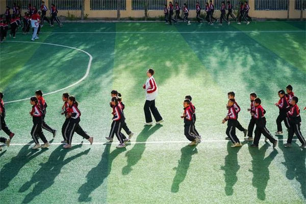 2025年4月24日,在新疆克州阿圖什市哈拉峻鄉謝依特小學,支教教師帶領學生晨跑。新華社記者 徐宏巖 攝
