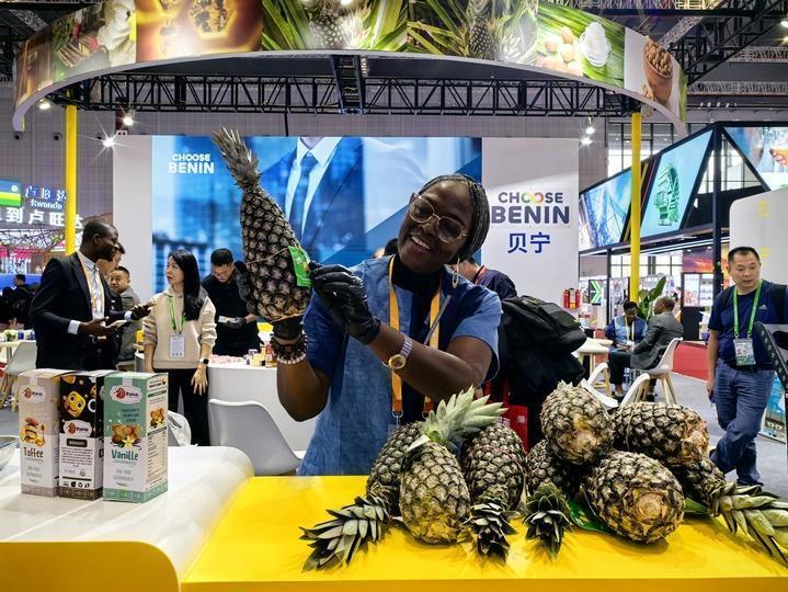 2024年11月7日,在上海舉行的第七屆中國國際進(jìn)口博覽會上,貝寧國家館工作人員展示本國特色農(nóng)產(chǎn)品——貝寧菠蘿。新華社記者 郝王樂 攝