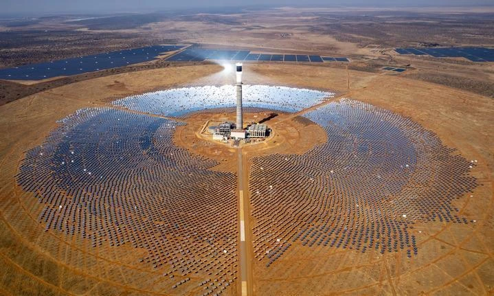 這是2024年8月20日在南非北開普省拍攝的由中國電建集團(tuán)山東電建三公司承建的南非紅石100兆瓦塔式熔鹽光熱電站項目(無人機(jī)照片)。新華社記者 張譽(yù)東 攝