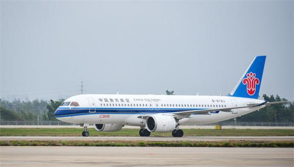 2024年12月11日,由C919執飛的中國南航CZ6786航班在??诿捞m國際機場降落,國產大飛機C919在海南的商業飛行“首秀”順利完成。新華社記者 楊冠宇 攝