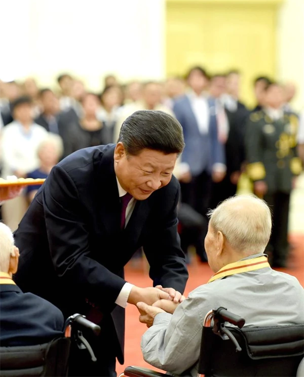 習近平總書記為這些在中國人民抗日戰爭中立下汗馬功勞的元勛或他們的遺屬一一佩掛上金光閃閃的紀念章,并與他們緊緊握手。當年已105歲高齡的劉漢生,是接受頒章的老戰士中年歲最長的一位。總書記走到他所坐的輪椅前,俯下身子為他佩掛上紀念章。
