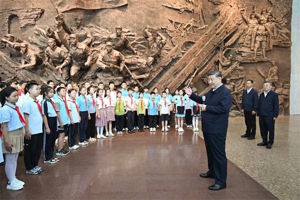 2025年7月7日下午,習近平總書記在位于陽泉市獅腦山的百團大戰紀念館考察時,同前來參觀的青少年學生和紀念館工作人員親切交流。新華社記者 謝環馳 攝