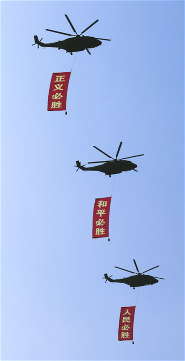 2025年9月3日,紀念中國人民抗日戰爭暨世界反法西斯戰爭勝利80周年大會在北京隆重舉行。這是空中護旗梯隊通過天安門廣場,3架直-8L運輸直升機分別懸掛“正義必勝”“和平必勝”“人民必勝”條幅。新華社記者 李鋼 攝
