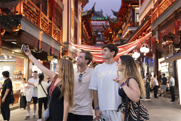 2025年7月21日,西班牙游客在上海豫園商城留影。新華社發(張悅 攝)