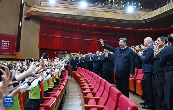 王滬寧、蔡奇、李干杰、何立峰、王小洪、雪克來提·扎克爾、諶貽琴、王東峰和劉振立,在新疆工作過的老同志,以及中央和國家機關有關部門負責同志、中央代表團全體成員一同觀看演出。