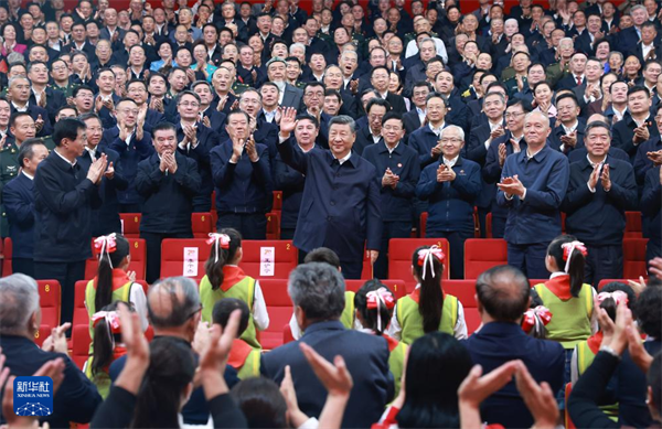 9月24日晚,慶祝新疆維吾爾自治區成立70周年文藝晚會《美麗新疆》在烏魯木齊文化中心大劇院舉行。中共中央總書記、國家主席、中央軍委主席習近平觀看演出。這是習近平向觀看演出的新疆各族干部群眾揮手致意。記者 謝環馳 攝