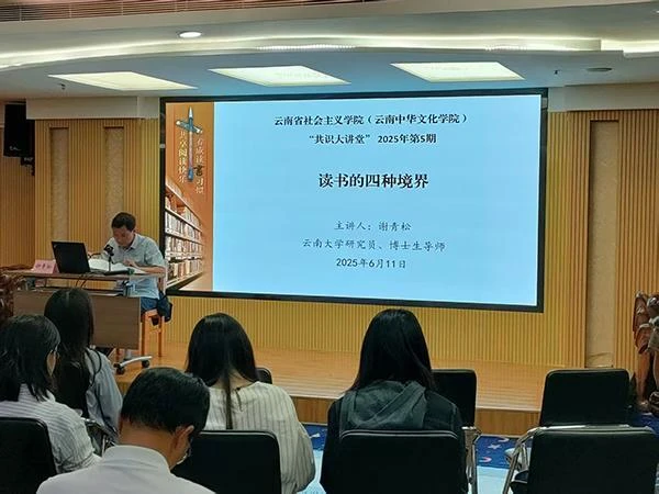 為加強書香社院建設(shè),在學(xué)院營造濃厚的愛讀書、讀好書、善讀書的良好氛圍,6月11日,云南省社會主義學(xué)院(云南中華文化學(xué)院)舉辦2025年第5期“共識大講堂”。本期講堂以“讀書的四種境界——中國古人的讀書理念、方法及境界”為主題,邀請云南大學(xué)研究員、博士生導(dǎo)師,云南省國學(xué)研究會會長謝青松擔任主講嘉賓。