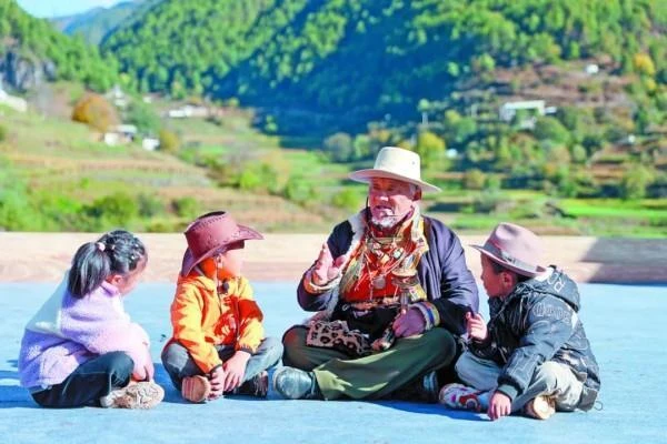 在香格里拉尼汝村,藏族爺爺給兒童講民族團結的故事。胡妤雅 攝